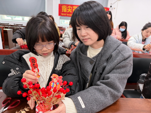 讲解结束后,居民们迅速投入到创作中,纷纷化身“花艺师”,动手修剪枝叶、搭配花材、固定造型。大家相互交流技巧、分享创意,有的专注地调整银柳的疏密,有的细心地点缀吉祥挂件,有的则和身边人探讨色彩搭配,现场氛围热烈而温馨。年长的居民手法娴熟,有条不紊地打造着自己的作品;年轻的居民大胆创新,在传统样式基础上加入个性元素,让福桶既饱含年味又独具特色。孩子们也在家长的陪伴下积极参与,小手笨拙却认真地摆放着花材,脸上满是专注与期待。